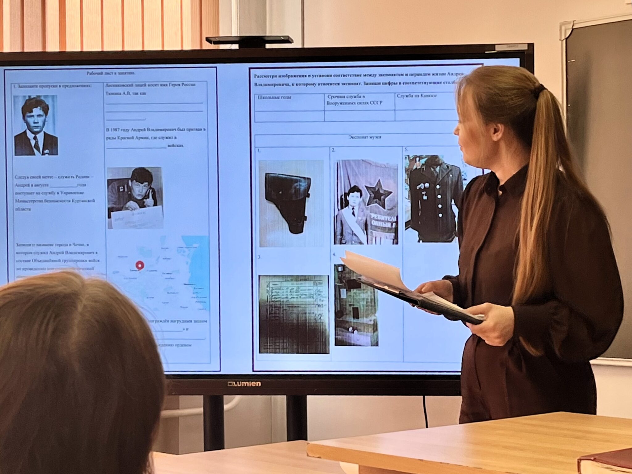 — Луканина Е.И., учитель истории и обществознания МКОУ «Лесниковский лицей им. Героя России Тюнина А.В.» — об организации музейного урока «Герой нашего лицея».
