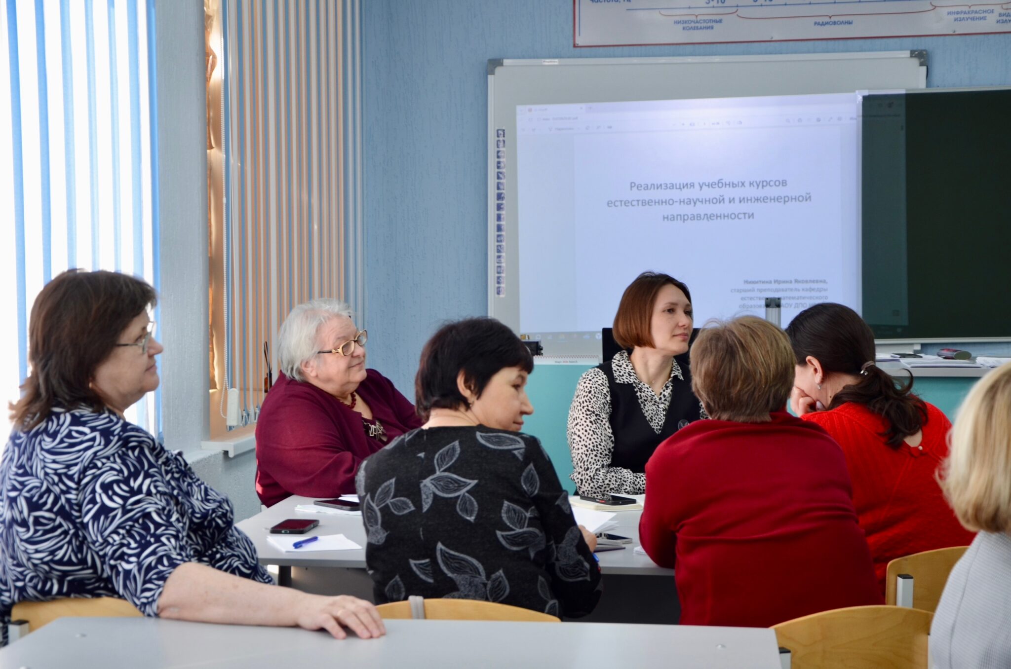 Для учителей химии, физики и биологии: Никитина И.Я. и Усольцева И.В., старшие преподаватели кафедры естественно-математического образования, провели секцию о реализации учебных курсов естественно-научной и инженерной направленности. Обсудили план мероприятий по развитию математического и естественно-научного образования, а также познакомили педагогов с возможностями портала «Единое содержание общего образования» и методикой составления дополнительных образовательных (общеразвивающих) программ. На секции учителя в группах разработали программу межпредметного курса, интегрирующего химию, физику и биологию.